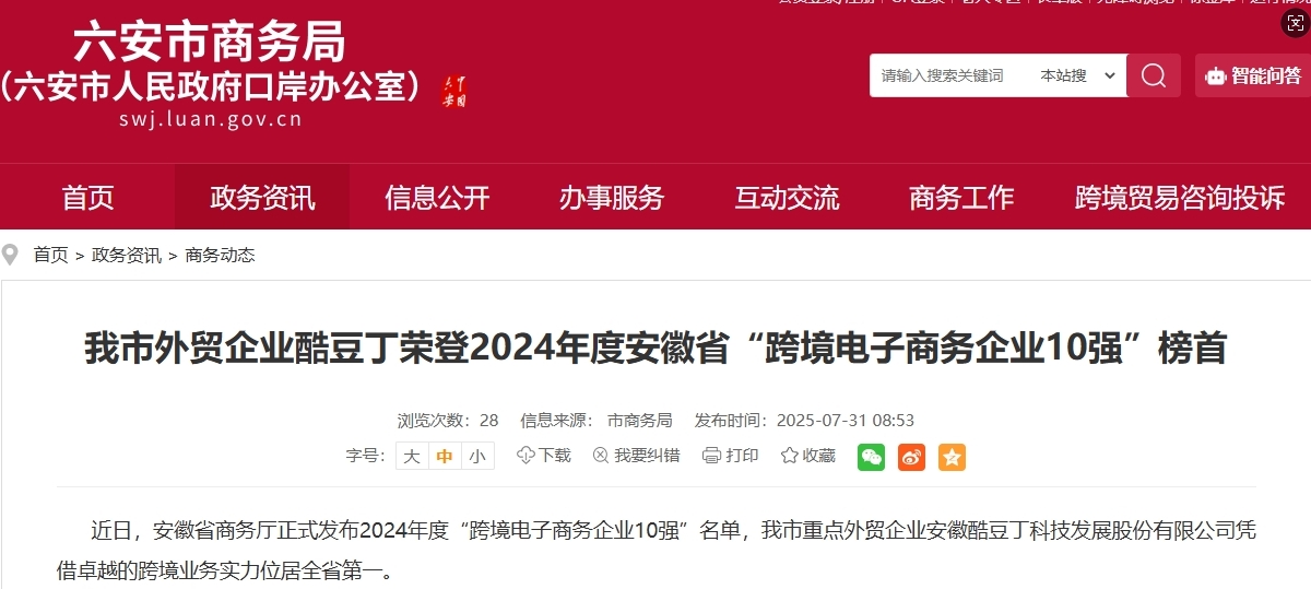 近日,安徽省商務(wù)廳正式發(fā)布2024年度“跨境電子商務(wù)企業(yè)10強”名單,我市重點外貿(mào)企業(yè)安徽酷豆丁科技發(fā)展股份有限公司憑借卓越的跨境業(yè)務(wù)實力位居全省第一。