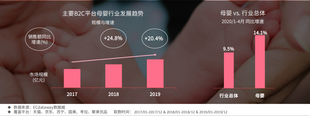 其次,母嬰行業(yè)B2C市場,最近三年保持穩(wěn)定增長。母嬰行業(yè)B2C市場2019年以20.4%的增長率保持穩(wěn)步的增長態(tài)勢,雖然相較于2018年增速下滑了4.4%,但依然領先于行業(yè)17.7%的平均增速。在疫情期間(2020年1-4月),行業(yè)總體同比增速是9.5%,母嬰電商銷售同比增速是14.1%,總的來說,母嬰電商的增速和發(fā)展趨勢還是優(yōu)于行業(yè)整體的。