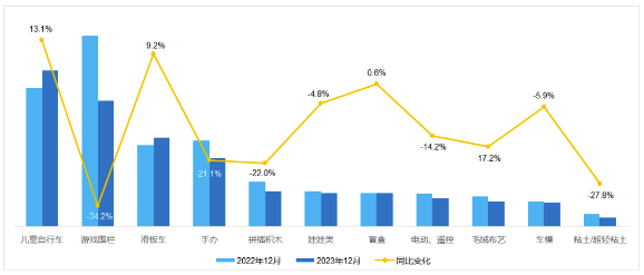 從均價來看,12月份同比增長的玩具主要品類有兒童自行車(13.1%)、滑板車(9.2%)、盲盒(0.6%),同比增長的嬰童用品主要品類有奶瓶(1.2%)。