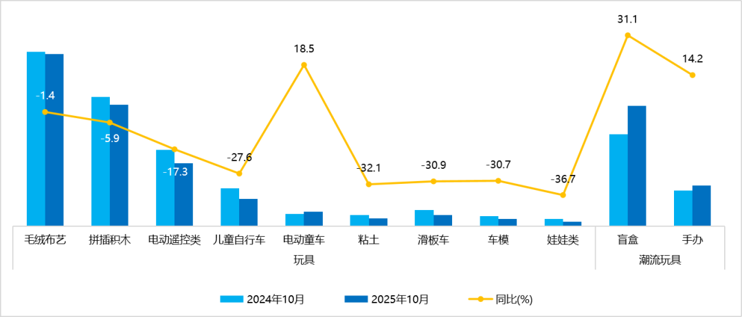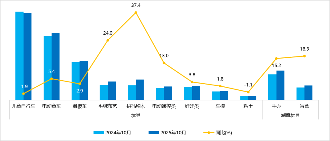 根據(jù)中國(guó)玩具和嬰童用品協(xié)會(huì)(簡(jiǎn)稱中國(guó)玩協(xié))對(duì)天貓平臺(tái)10月重點(diǎn)品類銷售數(shù)據(jù)監(jiān)測(cè)顯示,玩具重點(diǎn)品類中,電動(dòng)童車銷售額同比增長(zhǎng)18.5%;潮流玩具重點(diǎn)品類中,盲盒、手辦銷售額分別同比增長(zhǎng)31.1%和14.2%;嬰童用品重點(diǎn)品類中,童床和游戲圍欄銷售額分別同比增長(zhǎng)64.6%和16.5%。