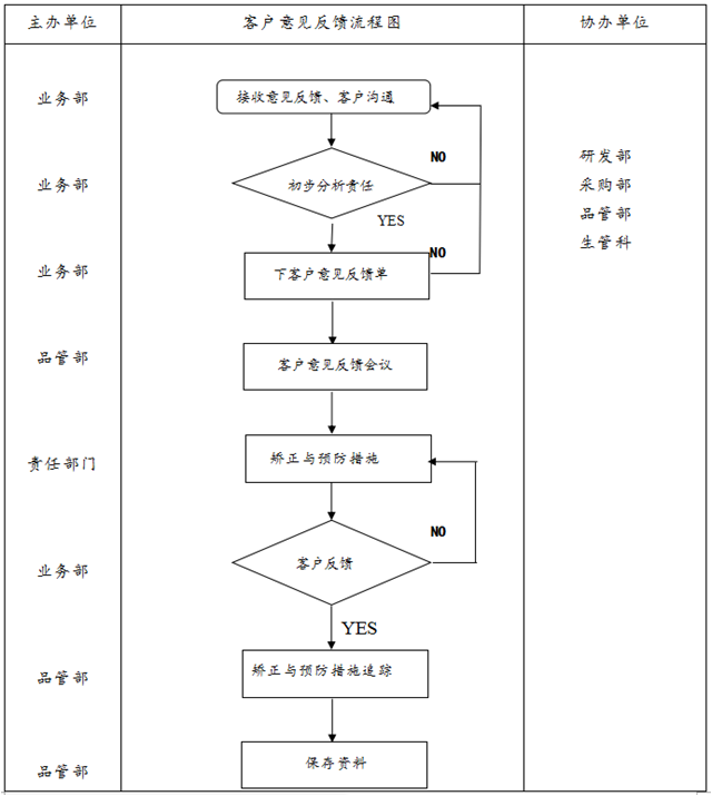 (1)業(yè)務(wù)部收到客戶反饋后下達(dá)《客戶意見反饋單》至品保部,由品保部分析、判定責(zé)任單位并召開會(huì)議要求責(zé)任單位在規(guī)定時(shí)間內(nèi)制定預(yù)防和改善措施,品保部對責(zé)任單位制定的預(yù)防和改善措施進(jìn)行驗(yàn)證,驗(yàn)證通過后,結(jié)束本次客訴。